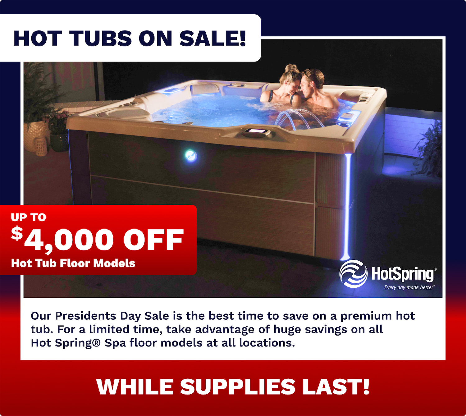 • Up to $4,000 OFF hot tub floor models
